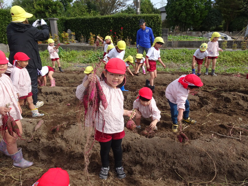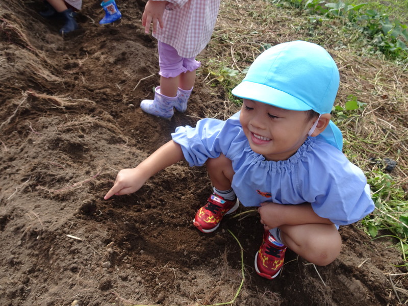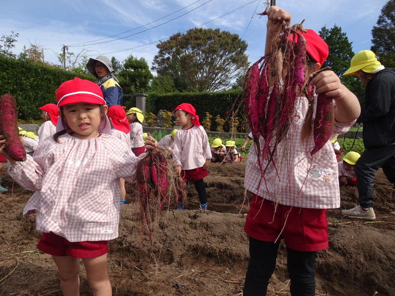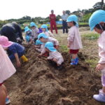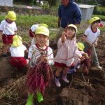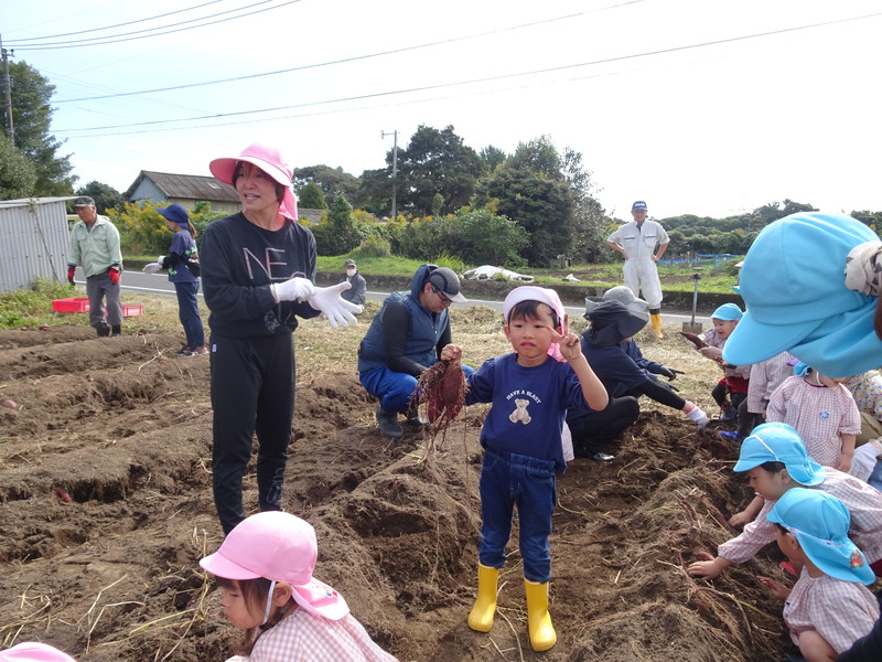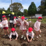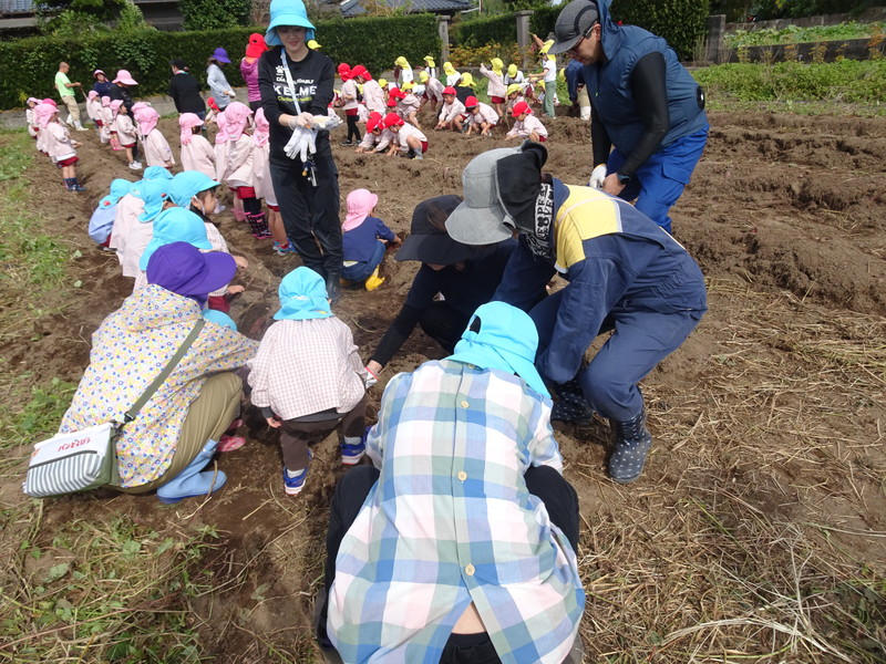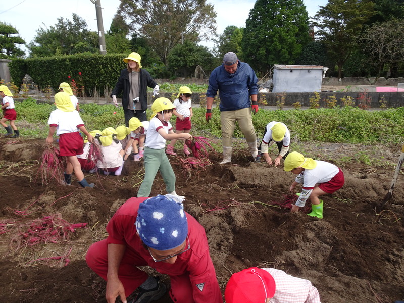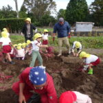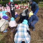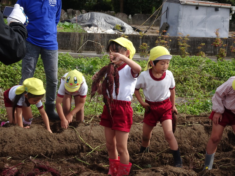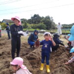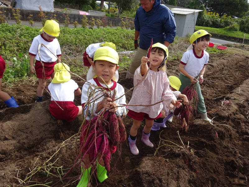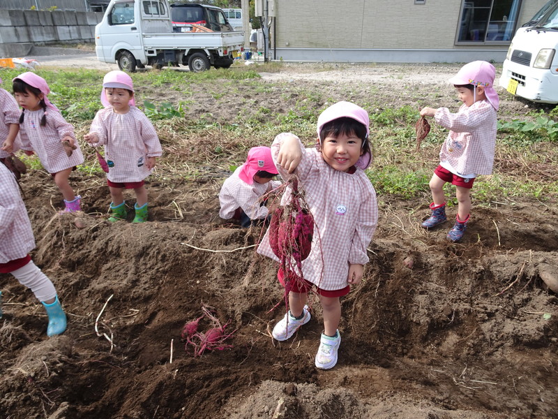 今日の笑顔 今日の笑顔 芋掘り遠足の様子♪ 2025年11月5日 10月30日(木)、石谷町にある有村さんの畑でお芋を育てていただき本日収穫に出かけてきました。おやじの会のお父さん達も朝早くからお手伝いに来てくださり「お芋ほり体験」を行いました。ツルを引っ張り「んしょ!よいしょ!」とお芋を掘り「とれたよー!」ととったお芋を高く持ち上げ大喜び!11月14日のお芋パーティーが楽しみな様子でした。