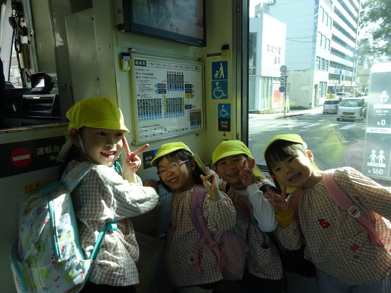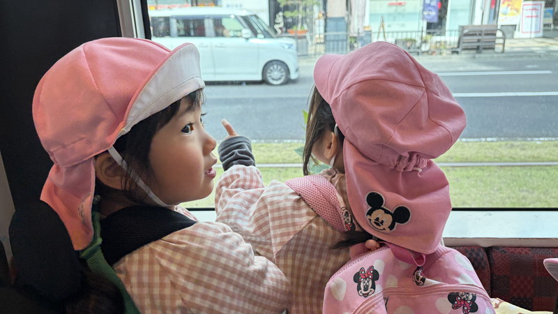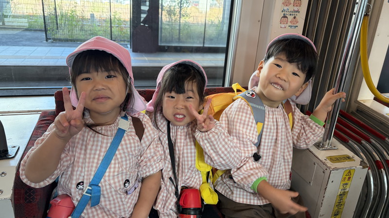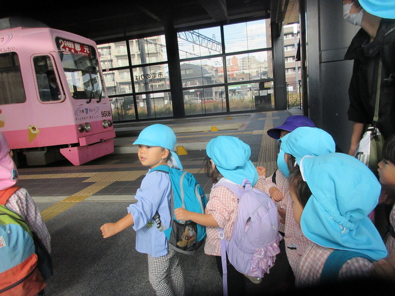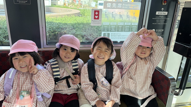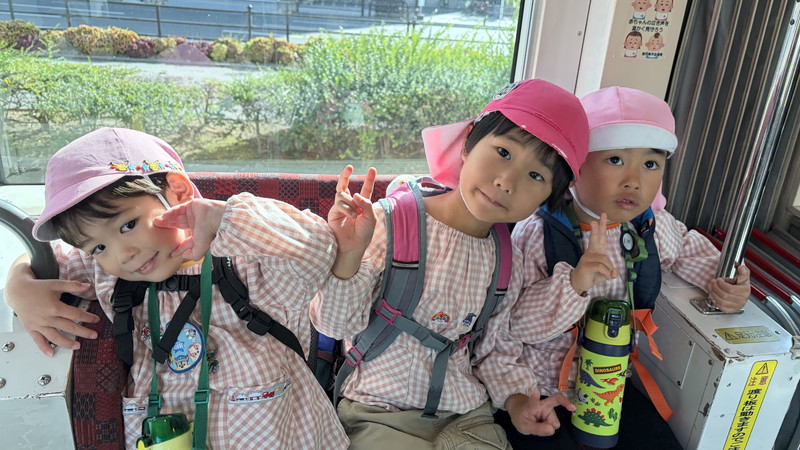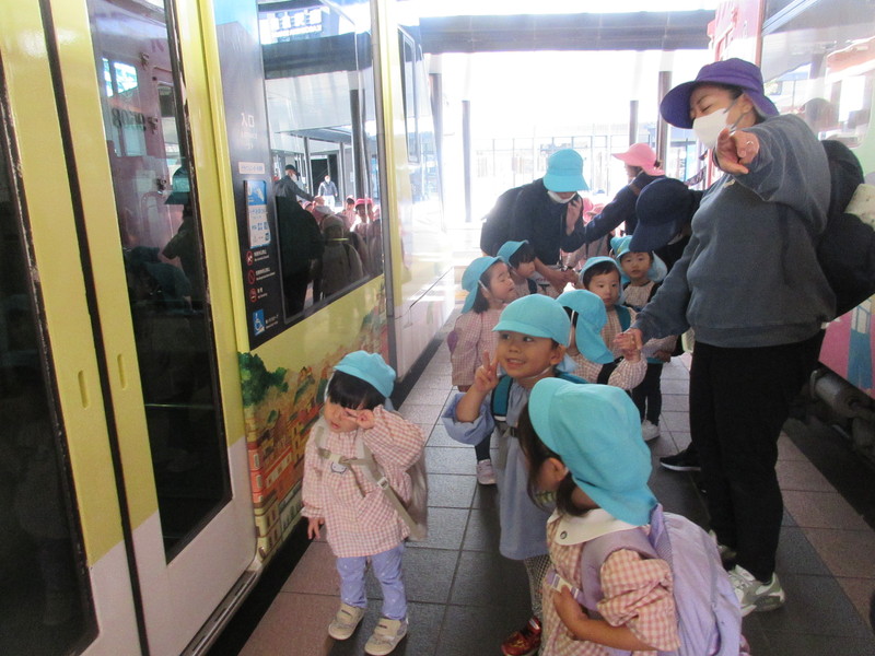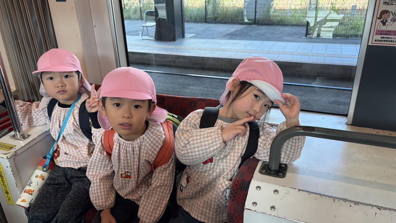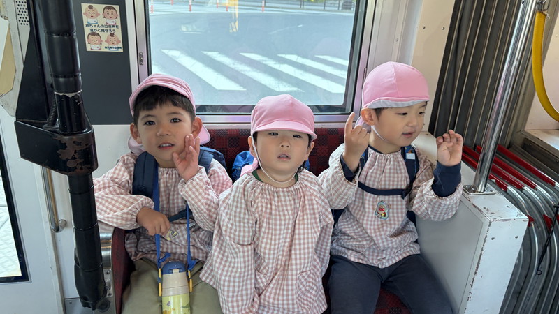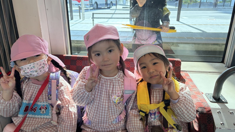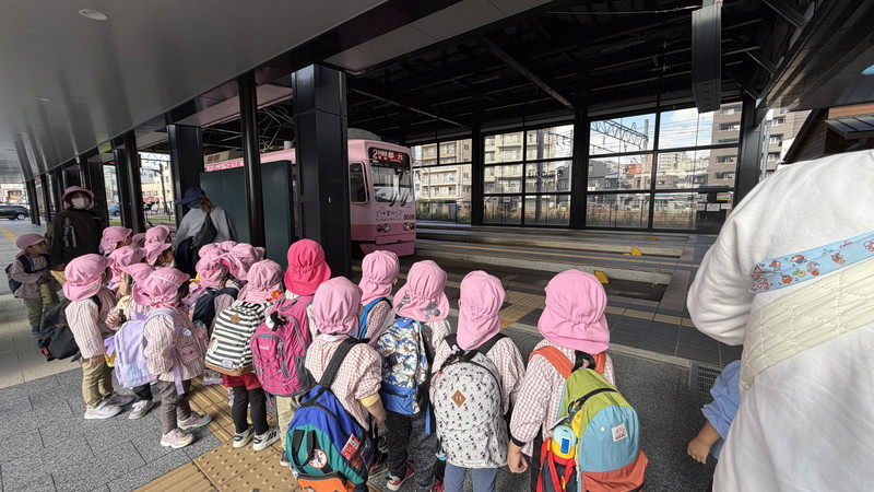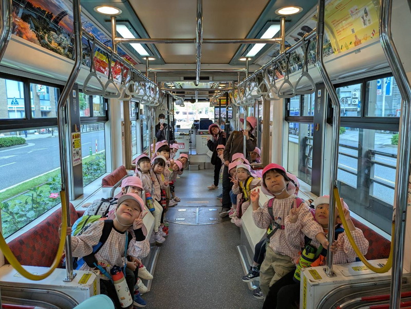 11月28日(金)、市電🚃乗車体験に出かけてきました。二組に分かれて乗車しました。貸切電車で年少々、年少組は、鹿児島駅前から神田まで乗車し、上荒田の杜公園で遊び、年中、年長組は神田から鹿児島駅まで乗車し、鹿児島駅からかんまちあまで徒歩移動し公園で遊んで園に帰ってきました。市電乗車体験では電車から見えるビル、看板を見てお友達や先生との会話が弾み、天文館が見えると「天文館、マルヤガーデン行ったことあるよ!」中央駅が見えてくると、観覧車やポケモンのイラストに大喜びの子ども達でした。市電乗車体験ができ、公共マナーもしっかりと守ることができた子ども達、市電の運転手さんにもしっかりと挨拶もできました。