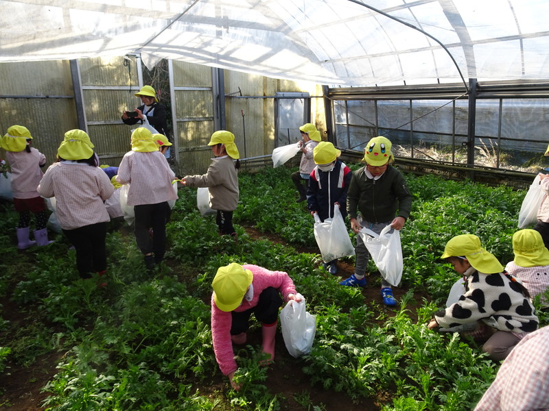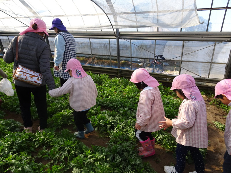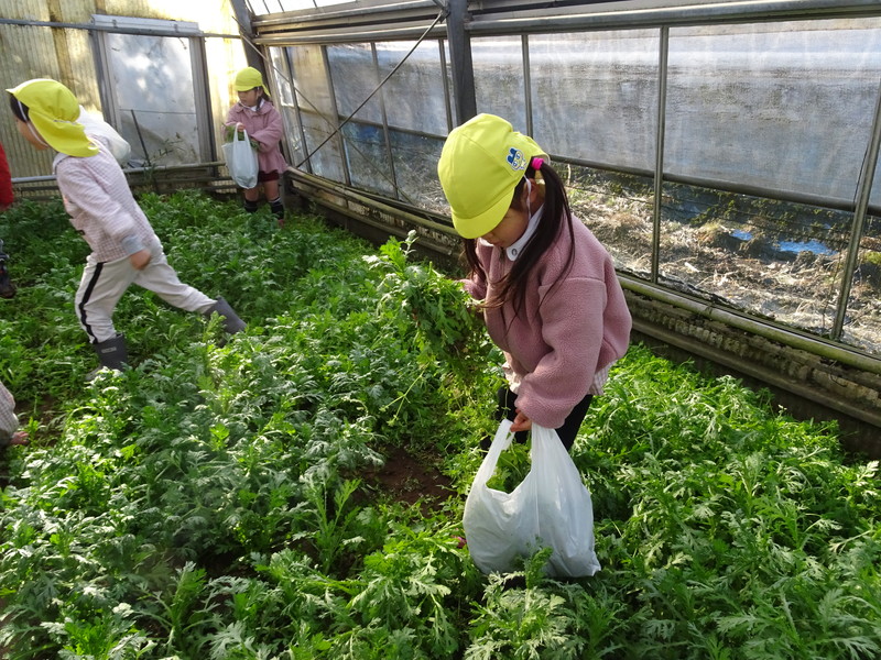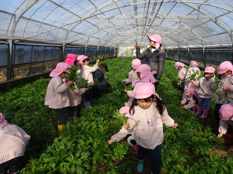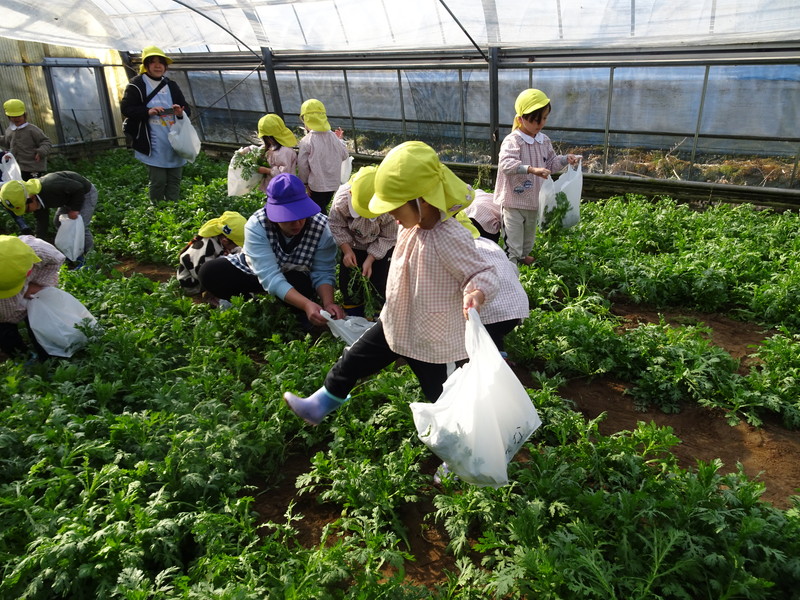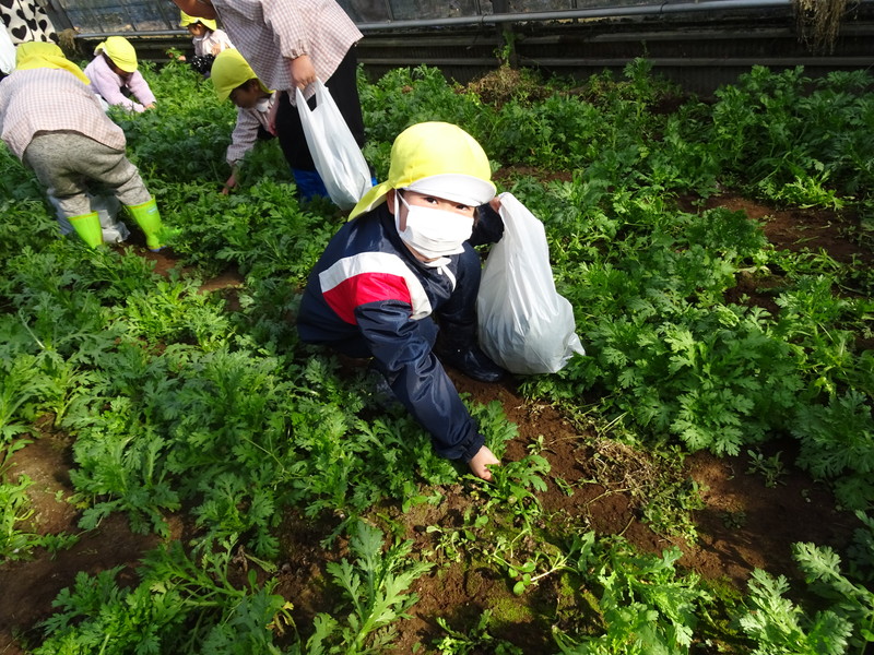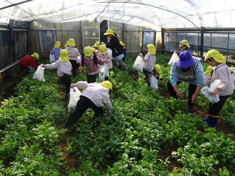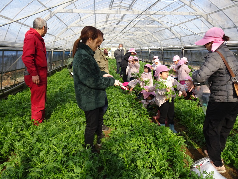 1月26日(月)、今年も石谷町にある有村さんのハウス栽培「春菊の収穫体験」をさせて頂きました。本日は、ひまわり組さんともも組さんで行き沢山の春菊を採らせていただきました。春菊を踏まないようにそおーと畑に入って採る姿、頑張ってとるぞーの掛け声がとても微笑ましい姿でした。