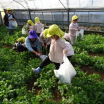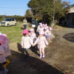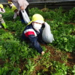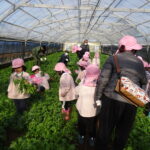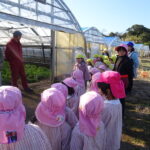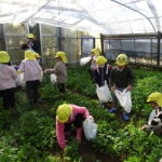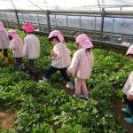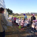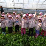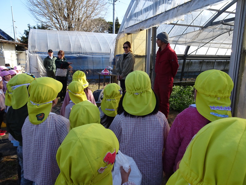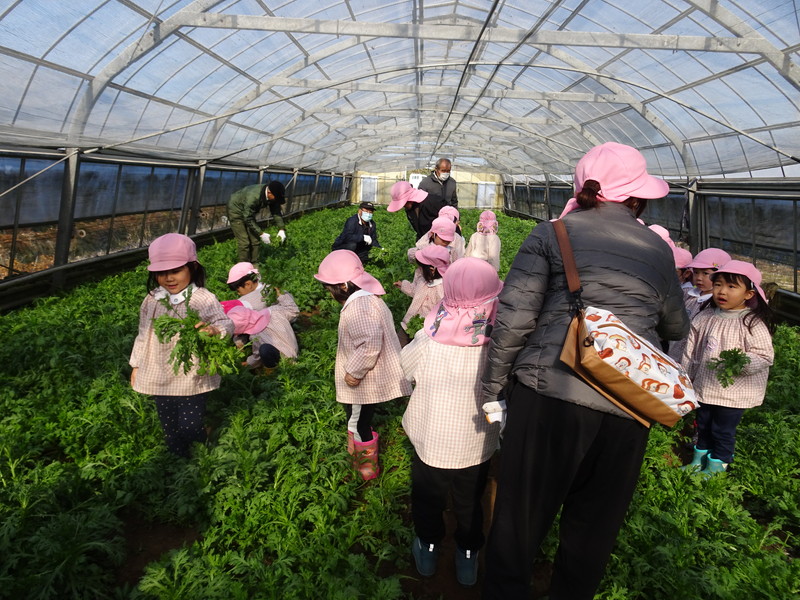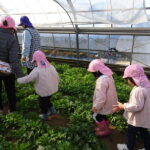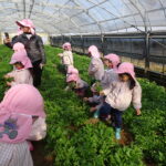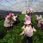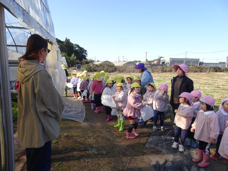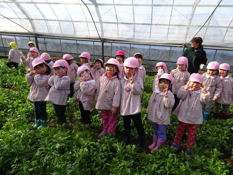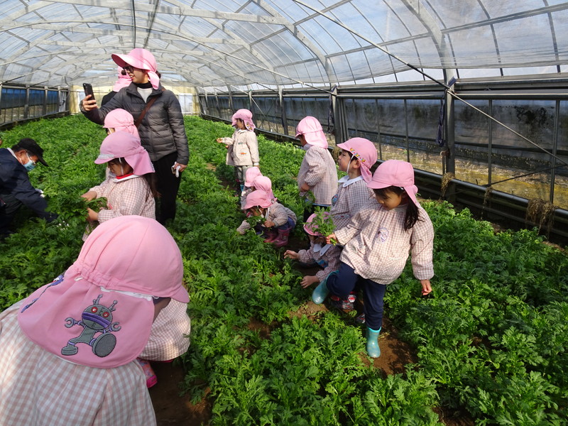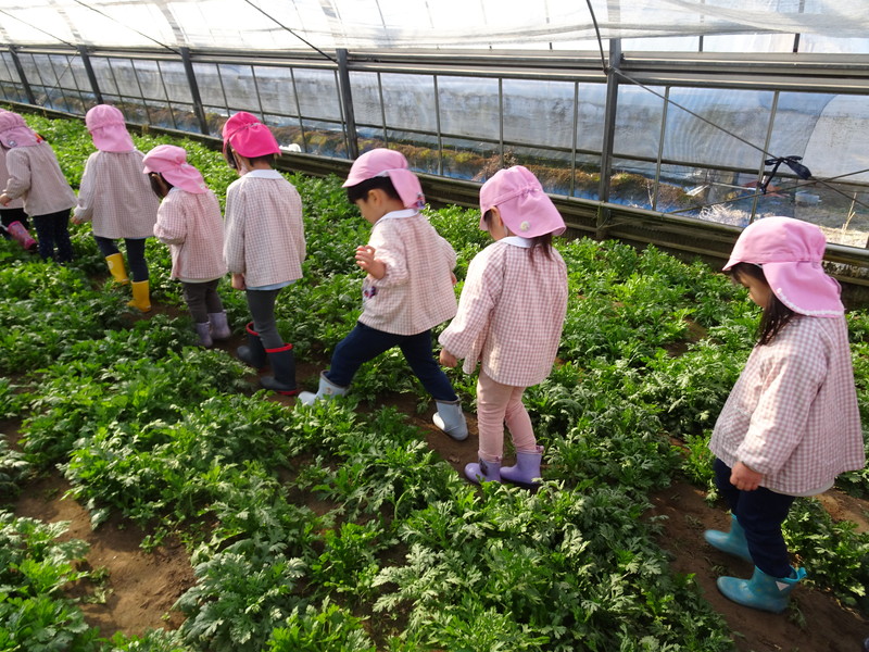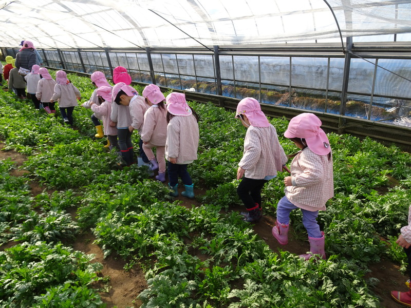 1月26日(月)、今年も石谷町にある有村さんのハウス栽培「春菊の収穫体験」をさせて頂きました。本日は、ひまわり組さんともも組さんで行き沢山の春菊を採らせていただきました。春菊を踏まないようにそおーと畑に入って採る姿、頑張ってとるぞーの掛け声がとても微笑ましい姿でした。